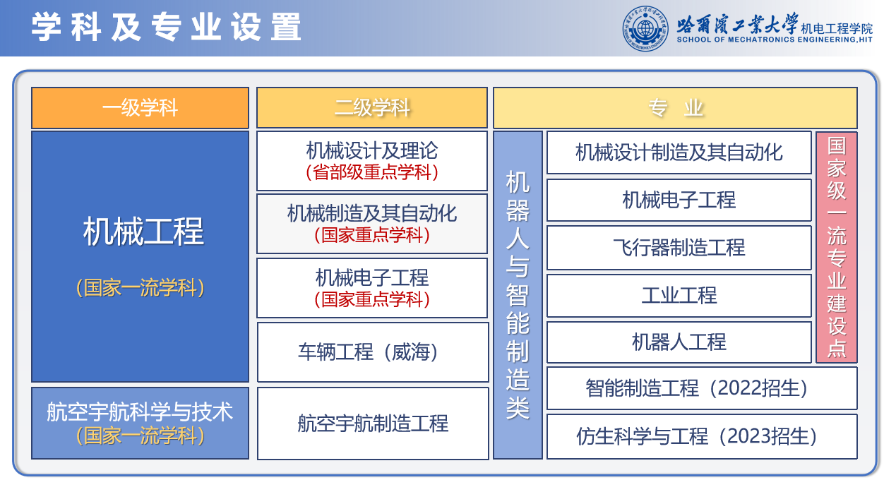 学院秉承哈工大“规格严格,功夫到家”的校训传统,坚持“育人为本、求实创新”的办学理念,在学科建设、人才培养、科研攻关等方面不断改革创新、锐意进取、追求卓越,为国家培养输送了数以万计的各行业骨干精英,培养出十余位中国工程院院士、百余名国家级人才等高端人才,200余位校友在航天、国防等领域的重大型号项目中担任总指挥、总设计师、主任/副主任设计师。以建设世界一流机械工程学科为目标,学院“立足航天、服务国防、面向国家重大需求”,打造了一批国之重器,培养了一批杰出人才,在智能机器人、深空探测、在轨服务等前沿领域研究水平国际领先,为我国机械工程学科发展与航天国防事业建设做出了突出贡献。