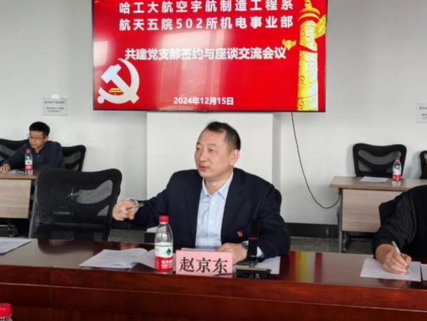 为进一步加强学院与航天院所的战略合作,拓展双方在党建引领下的科研与人才培养的深度融合,2024年12月15日上午9点,哈尔滨工业大学机电工程学院航空宇航制造工程系教工党支部与中国航天科技集团有限公司第五研究院502所机电事业部于科技创新大厦K723会议室开展了党支部共建签约仪式与座谈交流,校党委常委、副校长刘宏、学院党委书记赵京东、学院党委副书记徐洋、航天五院502所机电事业部部长张强、双方党支部党员代表与相关方向学生党员代表出席活动,学院党委书记赵京东教授主持活动。
